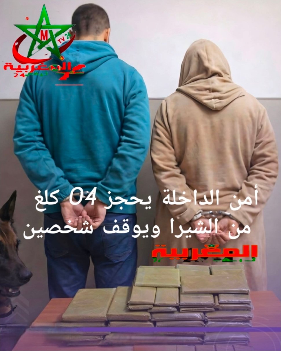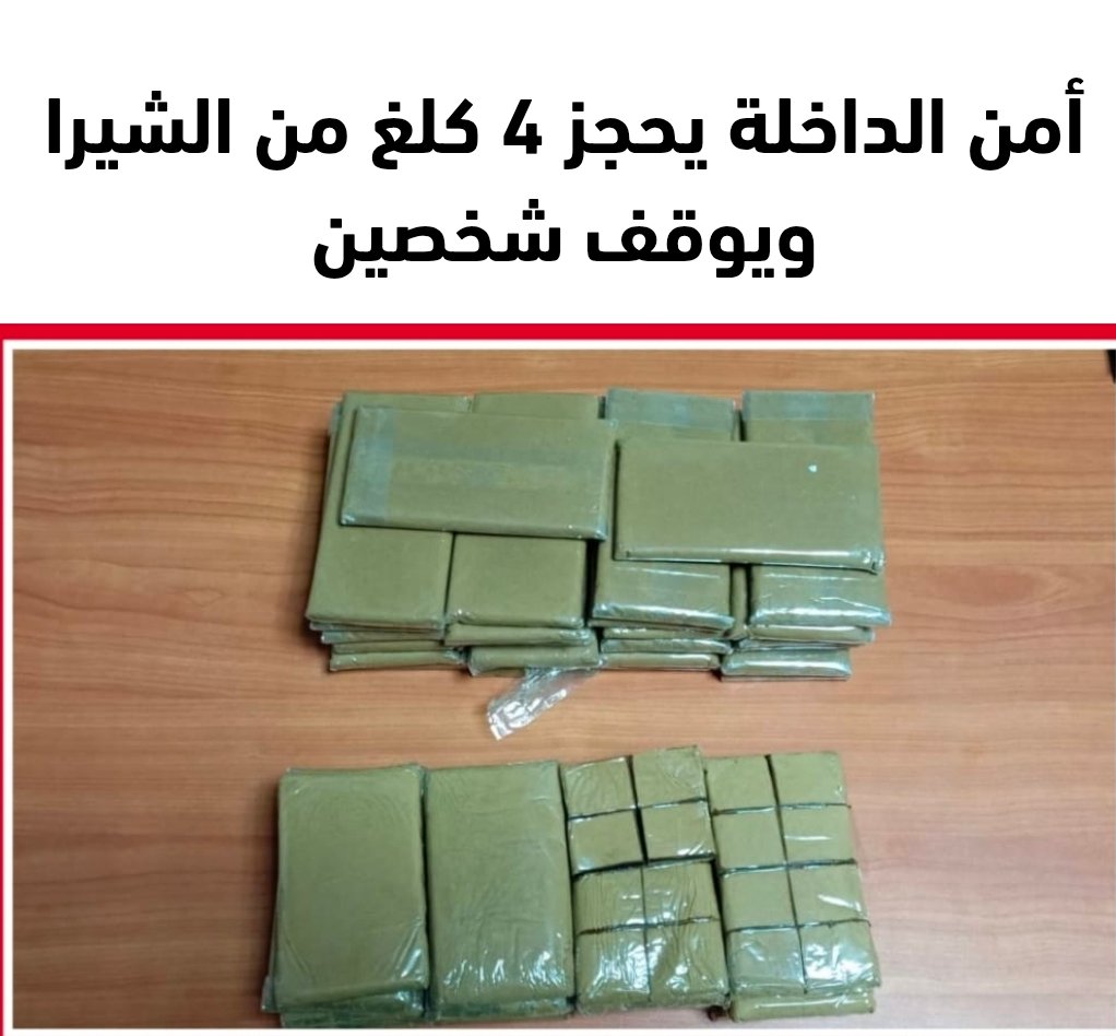تم حجز حوالي أربع كيلوغرامات من نفس المخدر وقد أمكن توقيف المشتبه فيه بحي الوحدة بمدينة الداخلة في حالة تلبس بترويج كمية من مخدر الشيرا على متن دراجة هوائية، لتسفر إجراءات التفتيش التى بوشرت بداخل مسكنه, بالاستعانة بالكلاب المدربة للشرطة، عن توقيف المشتبه فيها و حجز مجموعة من صفائح مخدر الشيرا علاوة على مبلغ مالي يشتبه في كونه من متحصلات هذا النشاط الإجرامى، وسكين متوسط الحجم خاص بتقطيع المخدر .