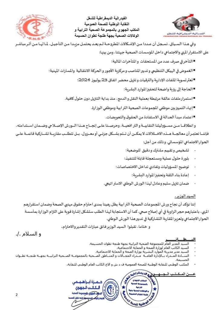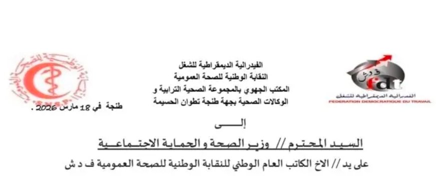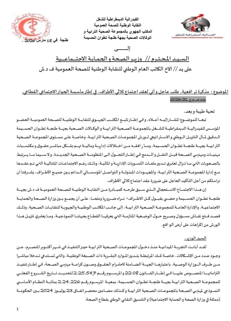 تبعا للموضوع المشار إليه أعلاه، و في إطار تتبع المكتب الجهوي للنقابة الوطنية للصحة العمومية العضو المؤسس للفيدرالية الديمقراطية للشغل بالمجموعة الصحية الترابية و الوكالات الصحية بجهة طنجة تطوان الحسيمة الدقيق لمآل التنزيل الوطني و الاستراتيجي لورش المجموعات الصحية الترابية، وخاصة على مستوى المجموعة الصحية الترابية بجهة طنجة تطوان الحسيمة، وما رافقه من اختلالات إدارية ومالية تهم بشكل مباشر حقوق و مكتسبات مهنيات ومهنيي الصحة قبل النقل و الدمج في إطار التحول الى المنظومة الصحية الجديدة، و لا سيما ما يرتبط بالصعوبات التي ما تزال تعتري تدبير ملفات التسويات الإدارية و المالية، وذلك رغم الاجتماعات المتتالية التي تم عقدها مع إدارة المجموعة الصحية الترابية، والمجهودات المبذولة و التواصل المؤسساتي الدائم بين جميع الأطراف، يشرفنا أن نراسلكم من أجل التأكيد العاجل على ضرورة عقد اجتماع ثلاثي الأطراف.