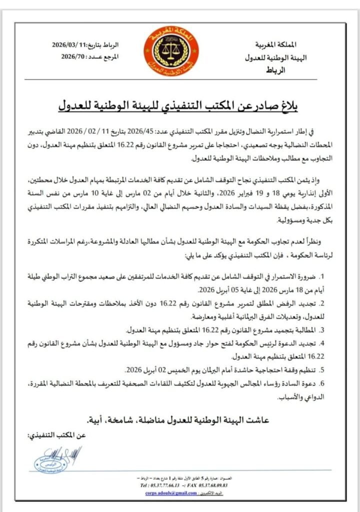 ويخوض العدول إضرابا وطنيا يمتد لـ19 يوما، ابتداء من 18 مارس إلى 5 أبريل 2026،وفي هذا السياق يرى ممثلو العدول أن مشروع القانون، بصيغته الحالية، لا يلبي تطلعات المهنة. ويجادلون بأن بعض بنوده تُخلّ بالتوازن مع المهن القانونية الأخرى، لا سيما فيما يتعلق بالمساواة في المعاملة. ووفقًا لهم، فإن دور العدل لا يقتصر على صياغة الوثائق القانونية فحسب، بل يساهم أيضًا في ضمان إتمام المعاملات وحماية حقوق المواطنين. هذه وظيفة عريقة ومحورية في النظام القانوني، يرون ضرورة أخذها بعين الاعتبار في أي إصلاح.