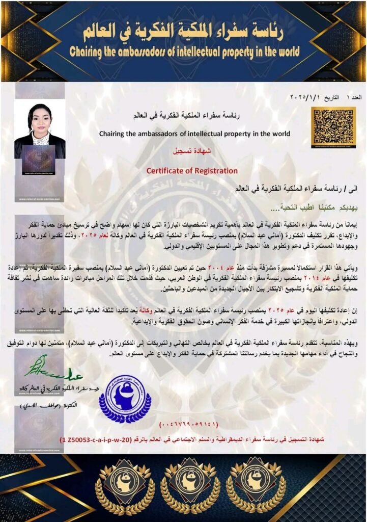 الى / رئاسة سفراء الملكية الفكرية في العالميهديكم مكتبنا اطيب التحية….إيماناً من رئاسة سفراء الملكية الفكرية في العالم بأهمية تكريم الشخصيات البارزة التي كان لها إسهام واضح في ترسيخ مبادئ حماية الفكر والإبداع، تقرر تكليف الدكتورة (أماني عبد السلام) بمنصب رئيسة سفراء الملكية الفكرية في العالم وكالةً لعام 2025، وذلك تقديراً لدورها البارز وجهودها المستمرة في دعم وتطوير هذا المجال على المستويين الإقليمي والدولي.