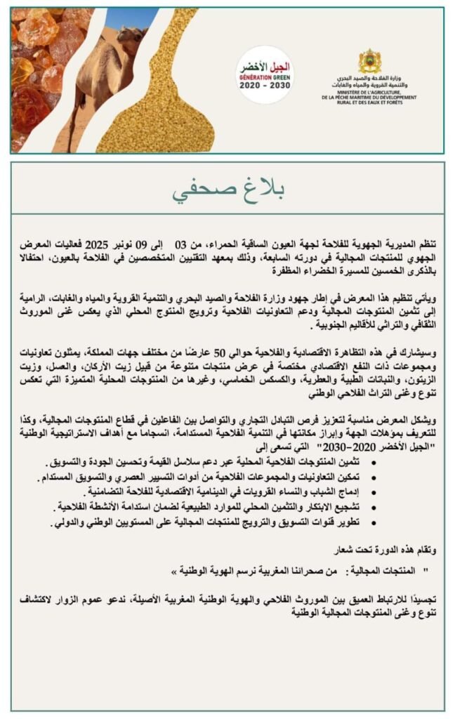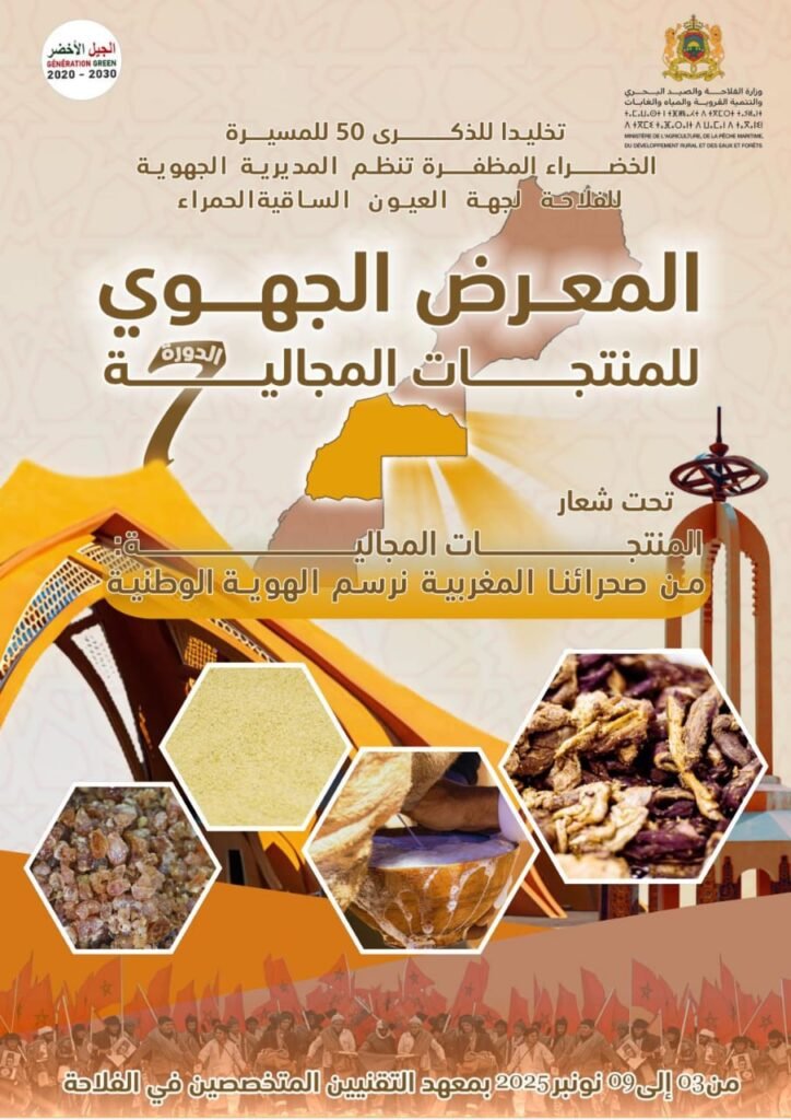 في أجواء وطنية مفعمة بالفخر والاعتزاز، وتزامنًا مع الاحتفالات بالذكرى الخمسين للمسيرة الخضراء المظفّرة، تحتضن مدينة العيون، من 3 إلى 9 نونبر 2025، فعاليات المعرض الجهوي السابع للمنتجات المجالية، الذي تنظمه المديرية الجهوية للفلاحة بجهة العيون الساقية الحمراء، بمعهد التقنيين المتخصصين في الفلاحة.
