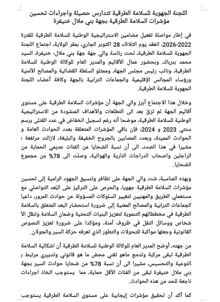 خلال هذا الاجتماع أبرز والي الجهة أن مؤشرات السلامة الطرقية على مستوى أقاليم الجهة لم ترْقَ بعد الى التطلعات والأهداف المنشودة من الاستراتيجية الوطنية للسلامة الطرقية، موضحا أنه رغم تسجيل انخفاض في عدد القتلى برسم سنتي 2023 و 2024، فإن باقي المؤشرات المتعلقة بعدد الحوادث العامة والحوادث المميتة، وبعدد المصابين بالجروح الخفيفة والبليغة، لازالت مرتفعة ؛ مشيرا في هذا الصدد، الى أن نسبة الضحايا من الفئات عديمي الحماية من الراجلين واصحاب الدراجات النارية والهوائية، وصلت الى 78% من مجموع الضحايا.