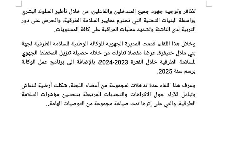 خلال هذا اللقاء، قدمت المديرة الجهوية للوكالة الوطنية للسلامة الطرقية لجهة بني ملال خنيفرة، عرضا مفصلا تناولت من خلاله حصيلة تنزيل المخطط الجهوي للسلامة الطرقية خلال الفترة 2023-2024، بالإضافة الى برنامج عمل الوكالة برسم سنة 2025.