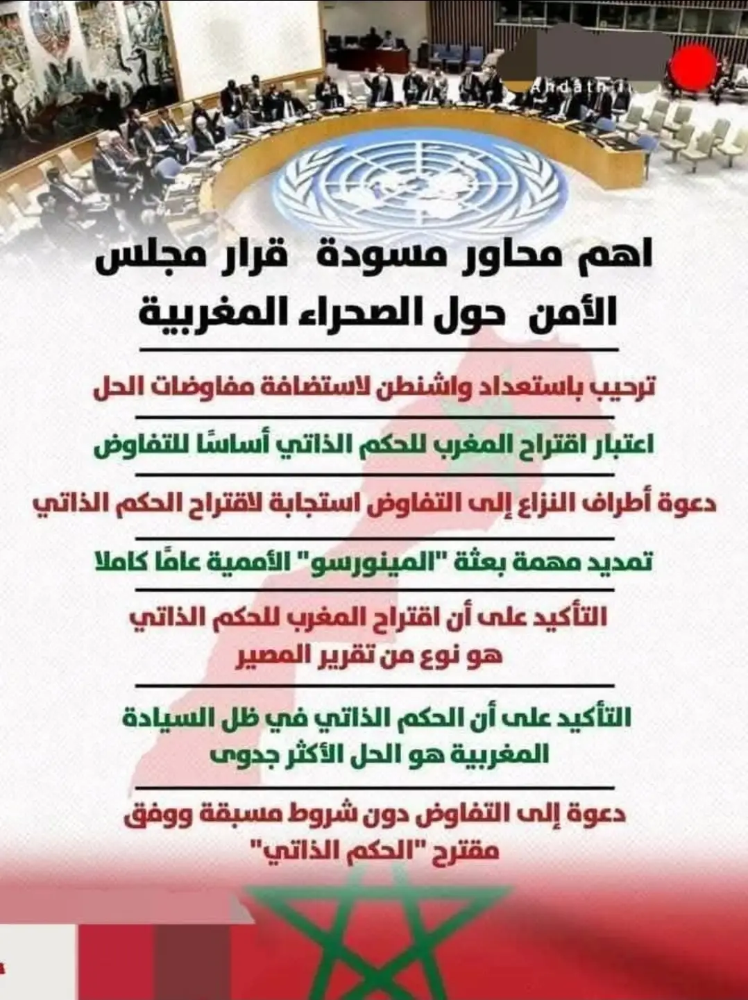 بعد اعتماد مجلس الأمن الدولي لقراره رقم 2797، الذي أيد الحكم الذاتي تحت السيادة المغربية كحل واقعي وجاد لقضية الصحراء، ليُكرّس الحكم الذاتي كحل واقعي لقضية الصحراء المغربية، وخطاب جلالة الملك محمد السادس جاء كتتويج للدبلوماسية المغربية. شكرًا للدول الداعمة، ودعوة للحوار السلمي. الصحراء مغربية أبدًا!