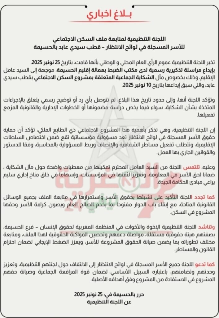 تخبر اللجنة التنظيمية عموم الرأي العام المحلي و الوطني بأنها قامت، بتاريخ 25 نونبر 2025، بإيداع مراسلة تذكيرية رسمية لدى مكتب الضبط بعمالة إقليم الحسيمة، موجهة إلى السيد عامل الإقليم، وذلك بخصوص مآل الشكاية الجماعية المتعلقة بمشروع السكن الاجتماعي بقطب سيدي عابد، والتي سبق إيداعها بتاريخ 10 نونبر 2025.