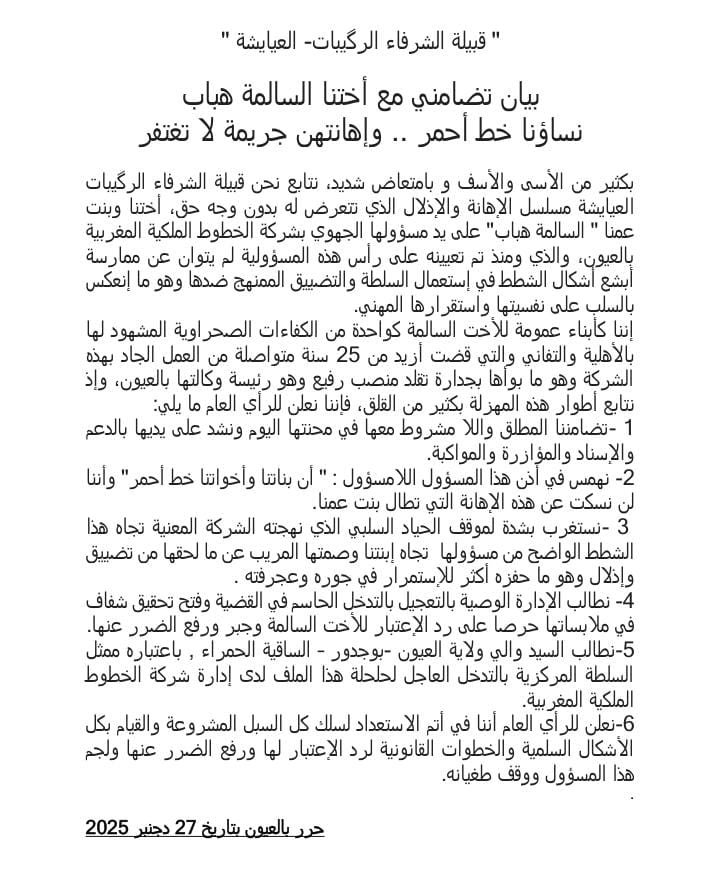 تعود هذه الواقعة إلى ما تتعرض له موظفة مغربية صحراوية مجدة، راكمت تجربة مهنية تجاوزت خمسة وعشرين عامًا داخل شركة الخطوط الملكية المغربية، وتدرجت بجدارة إلى أن تقلدت منصبًا مسؤولًا بمدينة العيون.